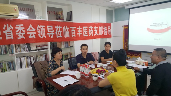 2016年9月22日,在农工党沈阳市委会专职副主委王莉、组织部部长赵丽的陪同下,农工党辽宁省委会组织部部长郑维民、副调研员张旭,到沈阳市百丰医药支部视察工作,并就农工党中央推广的星级支部评比工作进行调研。
