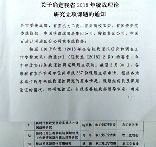 根据辽宁省委统战部《关于确定我省2018年统战理论研究立项课题的通知》(辽统发[2018]11号)文件精神,确定农工党辽宁省委会上报的《新时代参政党坚定实施人才强国战略研究》、《新时代非公有制经济领域统战工作新情况新问题及对策研究》、《统战系统新媒体应用研究》三篇理论研究课题获省委统战部立项。(农工党辽宁省委会)