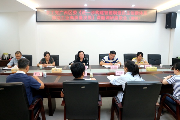 在实地调研结束后,调研组成员来到农工党柳州市委会议室,与来自市发改委、市工信局及企业的同志就本次调研课题进行座谈。来自市发改委、市工信局的同志介绍了柳州智能制造和机器人产业发展的总体情况、政府支持政策、目前存在的问题等。同时,来自柳州市开宇机器人有限公司的负责人结合自身实践,介绍了自身科研、企业发展的现状和存在的问题。调研组详细询问了柳州智能制造机制体制的创新、推进智能制造和机器人产业发展中集成系统开发的困难及科研领域人才队伍等内容,并就上述问题进行深入交流。