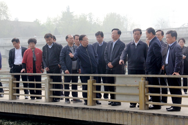 4月6日,调研组在贾鲁河治理工程现场看到,两岸杂物被清理一空,河槽疏挖正在进行,施工现场都覆盖着防尘网。据了解,郑州市将采取截污疏浚、引水注入、提升水质等综合措施,力争水质达到四类以上。在五龙口污水处理厂、西流湖和新密市双洎河人工湿地、云岩宫水库等地,调研组认真了解污水处理、水质改善和生态水系综合治理情况。4月7日,在许昌市,调研组到护城河、灞陵河、饮马河、梦清园、北海公园、鹿鸣湖、三达人工污水净化公司等地,就城市水系治理、生态修复、水质净化等情况进行视察调研。