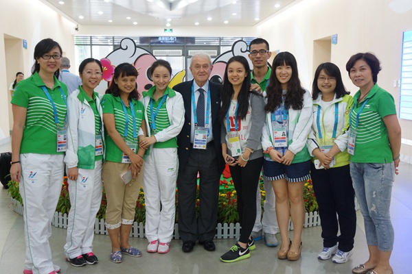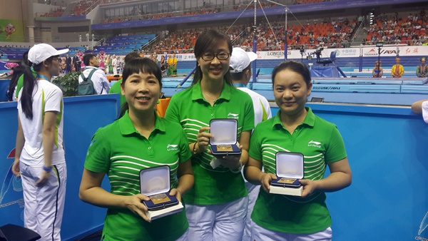 2014年10月12日,姜碧英(中)荣获国际体联授予优秀工作人员荣誉勋章