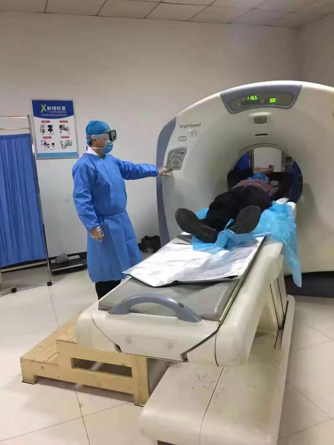 农工党马鞍山市中医院支部主委周兆金为发热门诊病人做CT检查。
