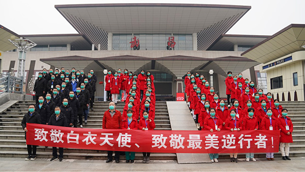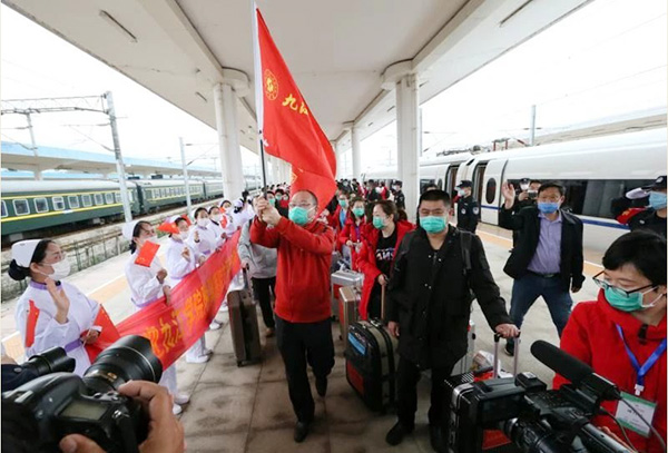 3月22日中午,江西省第九批援鄂医疗队九江学院附属医院重症医疗队85名医护人员圆满完成援鄂任务,从武昌站乘坐“凯旋号”高铁,载誉归来。