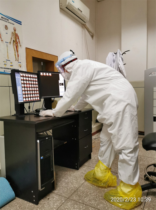 工作中,他认真负责,一丝不苟。他每天要从几十位发热患者的上万幅CT薄层图像中仔细观察,认真研判并结合患者有无发热体征、流行病学史、疫区接触史及血液检查结果等多方面来捕捉蛛丝马迹,发现并判断出疑似患者,第一时间做出正确诊断,对疑似患者及时做出预警,第一时间采取隔离措施,为全院新型冠状病毒肺炎的诊疗工作把好第一关。