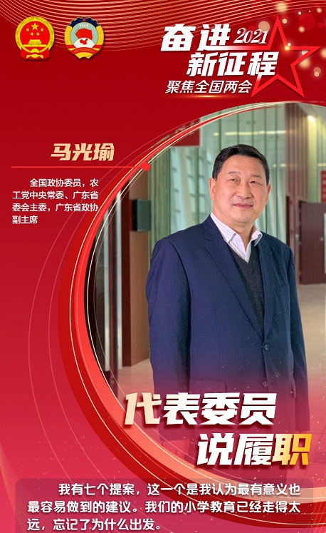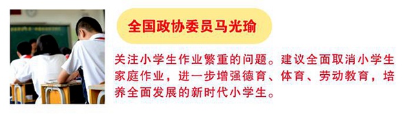 “小学生的家庭作业不仅仅是一个学习问题,它实际上已经变成了一个很重大的社会问题,需要全社会各方的关注。”今年全国两会,全国政协委员、广东省政协副主席,农工党中央常委、广东省委会主委马光瑜特别关注到小学生作业繁重的问题,他在提案中建议,全面取消小学生家庭作业,厘清学校与家长的责任边界,推迟小学放学时间,与父母下班时间相一致,让学生做完作业再回家,同时增加体育运动和家务劳动,增强学生体能。同时,应组织专家学者科学编制教材,减少笔头训练。