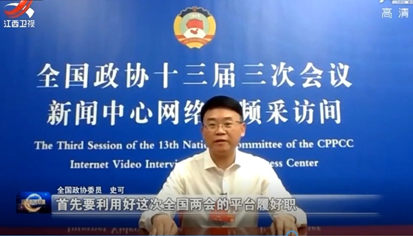 2020年5月21日下午,全国政协十三届三次会议在京开幕。全国政协委员、农工党江西省委会主委史可,在全国政协十三届三次会议新闻中心网络视频采访间接受江西卫视采访时表示,要利用好全国两会平台积极履职尽责,为江西推进高质量跨越式发展、打造内陆双向开放高地鼓与呼。(农工党江西省委会)