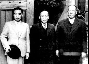 1946年,郭沫若(中)与中共领导人周恩来(左)、李维汉(右)