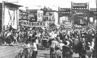 北平学生在东四牌楼前举行“反美扶日”爱国大游行