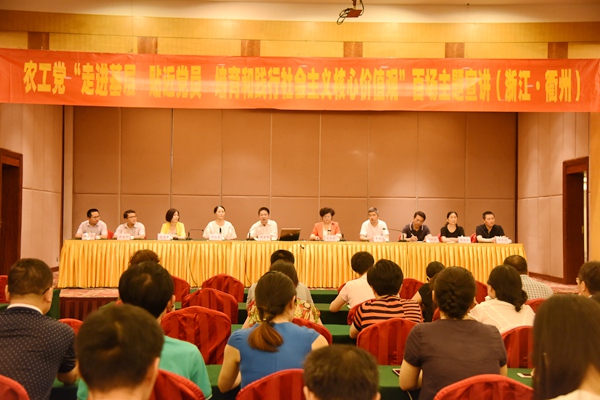 2016年6月30日下午,农工党“走进基层、贴近党员,培育和践行社会主义核心价值观”百场主题宣讲走进浙江衢州。衢州市政协副主席、农工党衢州市委会主委吕玉茹主持活动。农工党浙江省委会副主委郑勇军、中共衢州市委统战部常务副部长曾越河分别致辞。农工党浙江省委会宣传部部长戚青青,衢州市委会副主委钭跃铨、彭魏云、周江文等出席活动。