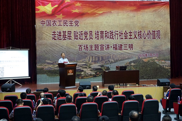 室外将近四十度的高温,来回奔波近两百公里,听课长达三个小时……这样的数据是否让你感到辛劳?但来自南平的农工党党员却说:“收获很大!值得一来”、“听讲很快乐”、“秦教授讲得不是一般的好”。怎样的一场宣讲报告会能够如此引人入胜?2016年7月25日,农工党“走进基层 贴近党员 培育和践行社会主义核心价值观”百场主题宣讲报告会在福建三明开讲,点燃了农工党党员加强思想政治学习的热情。