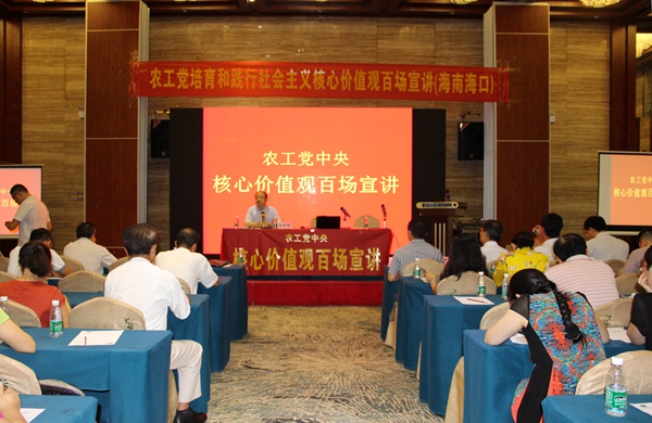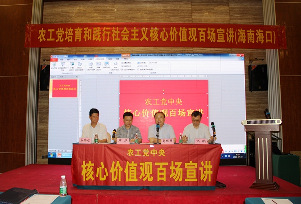 2016年7月30日,农工党“走进基层、贴近党员,培育和践行社会主义核心价值观”百场主题宣讲报告会在海南海口举行。这是继今年二月海口试讲,四月海口、三亚宣讲,宣讲报告会第三次在海口举行。至此,百场主题宣讲报告会已经在海南举办三场。7月31日,宣讲团还在儋州市举办第四场。农工党海南省委会专职副主委毕华出席并致辞。农工党中央宣讲团领队刘保明主持宣讲报告会。