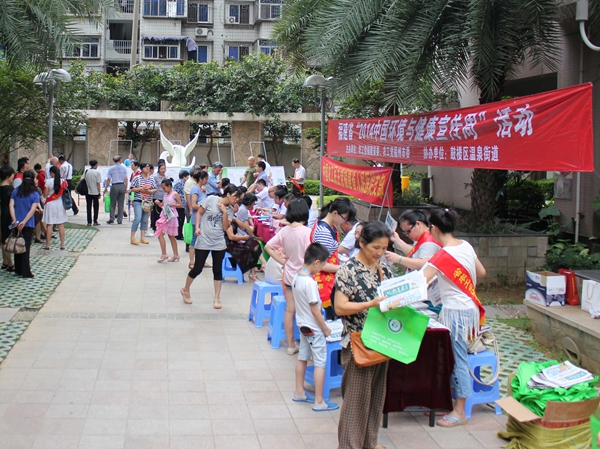 2014年6月22日上午,农工党福建省委会、农工党福州市委会和鼓楼区温泉街道在福州市鼓楼区汤边社区蔚然国际小区联合开展2014福建“中国环境与健康宣传周”活动。农工党福建省委会专职副主委赖应辉、秘书长陈巧等出席活动。