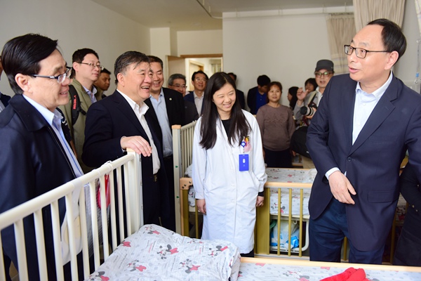 考察的第一站,在上海交通大学医学院附属新华医院。新华医院创建于1958年,是新中国成立以来上海自行设计建设的首家综合性医院。在新华医院,调研组听取了上海市儿童罕见病诊治中心和新华医院妇幼相关工作汇报,视察了上海市儿科医学研究所、儿外科病房、文化长廊“博导墙”、产科特需病房。陈竺详细了解了医院医疗服务价格、设备国产化程度、医保报销比例,以及医院发展规划等情况。