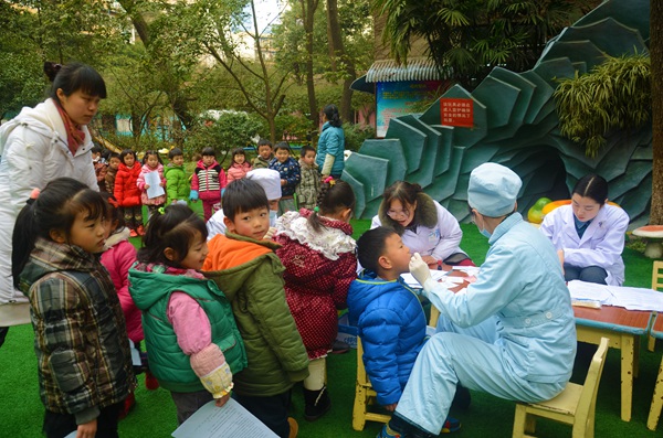 为降低幼儿龋齿的患病率,2015年寒假前,成都市第六人民医院口腔科和院感科的医务人员,陆续免费为成华区辖区幼儿园的上千余名幼儿,进行口腔筛查及涂氟防龋工作。