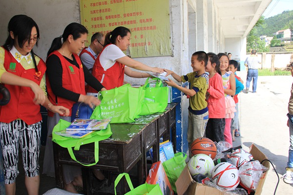 松木塘镇天子山村小学地处桃江、安化交界的偏远山区,经济落后,青壮年大多外出打工,全校106位学生全都是留守儿童。学校条件简陋,没有广播和体育器材,也没有图书室。在这次活动中,农工党党员和义工队员们向每位同学发放了文具用品和牛奶,并向学校捐赠了一套广播音响设备和篮球、羽毛球等一批体育器材和新的书柜。
