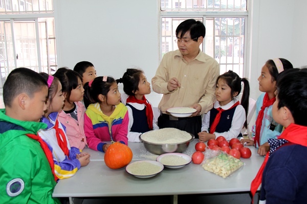支部副主委胡剑老师平时注意观察,看到周围的孩子们常常抛洒饭菜,很有感触,特意精心准备了PPT,搬来了作物蔬菜,以“爱惜粮食,从我做起”为主题,给孩子们从粮食的起源、分类讲到粮食生产和安全,从中国的粮食储备进口讲到世界上还有8亿多贫困人口面临着食物不足、营养不良的威胁……实物讲解,图文并茂,有数字,有故事,强烈吸引和震撼了孩子们。“胡老师说农民伯伯都是别人一下雨就往屋里跑,而他们下雨就往屋外跑,我很感动,以后会更加珍惜粮食!”、“我要改了挑食的毛病,不浪费”孩子们的童言童语纯真可爱。