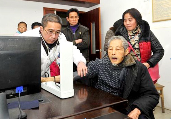 万红梅来到蒋国珍住处,她走到蒋国珍老人身旁,询问他的身体情况。但是,蒋国珍表情迷糊,摇摇头,示意听不见。在身旁照料他的侄女蒋根英大声地用本地方言和蒋国珍重复万红梅的问题。蒋国珍试图回答,但是他嗓子沙哑,吐字不清,大家都无法辨别他在说什么。万红梅见蒋国珍面色苍白、浮肿,先进行简单检查后,决定带老人到医院做一个全面的身体检查。随即驱车将蒋国珍老人和蒋根英接到罗坊镇中心卫生院,院长李小军积极配合,安排医护人员为蒋国珍做了血压、抽血化验、鼻腔等一系列检查。