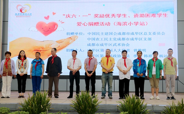 2017年5月15日,农工党成都市成华区支部携手成华区民建总支等赴成华区海滨小学,开展了“庆六一”奖励优秀学生和资助贫困学生爱心捐赠活动。