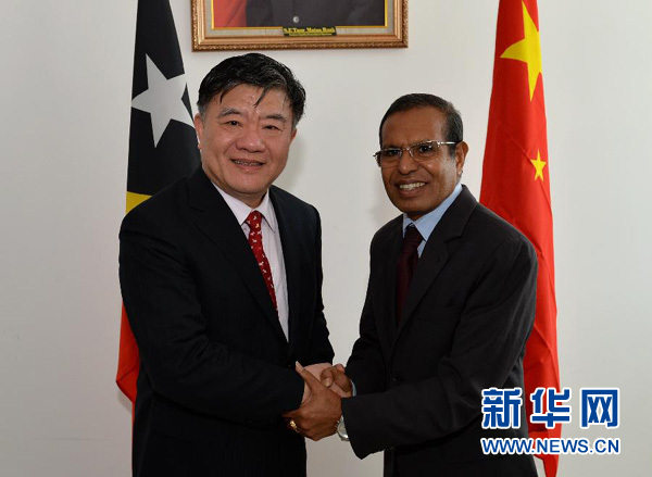4月1日,正在东帝汶访问的陈竺(左)在帝力会见东帝汶总统鲁阿克