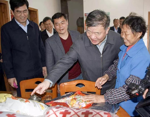来到博爱广场,陈竺一行考察了中国红十字会在当地开展的“博爱家园”项目,实地察看基础设施及资料宣传牌等。在山香村赣商爱心卫生计生服务室,陈竺与乡村医生一一握手,深入了解卫生室运行情况,详细询问药品管理和疾控工作。得知卫生室给乡亲们提供全面周到的健康服务,陈竺十分高兴,并鼓励他们从小处着手,心贴心服务,倡导健康生活理念,在健康中国建设和促进健康脱贫等方面积极作为,争取发挥更大作用。