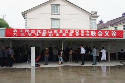 5月19日上午,雨下的很大,农工党昆山总支主委李修昌带领参加联合义诊的十三位医疗专家冒雨赶往周市镇东明村举行义诊。
