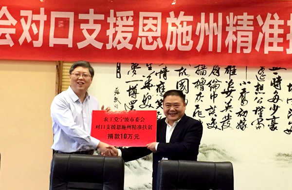 在“农工党宁波市委会对口支援恩施州精准扶贫座谈会”上,徐翔、张银莲和杨德华分别介绍了各地的经济社会发展情况、党派工作情况,并就精准扶贫问题展开了热烈的交流讨论。会上,徐翔代表农工党宁波市委会向恩施州捐赠10万元人民币,通过农工党恩施州委会用于当地的“精准扶贫”帮扶工作。