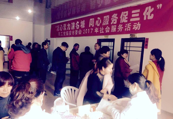 2017325日上午,农工党临安市委会组织医卫界党员16人赴杭州临安华宇橡塑有限公司开展免费义诊活动。临安市残联主席徐玉平、农工党临安市委会专职副主委詹寿明和市残疾人康复中心负责人等出席活动。