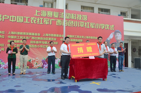 2017年6月20日上午,“上海赛复流动科技馆捐赠仪式”在广西百色小平红军小学(田东县平马镇上法小学)举行。农工党上海市委会专职副主委陈芳源,上海科普教育发展基金会副理事长金建敏,上海市慈善基金会副理事长施南昌,农工党广西区委会专职副主委何玉庭,中共田东县委常委、统战部部长王伟等领导出席仪式。