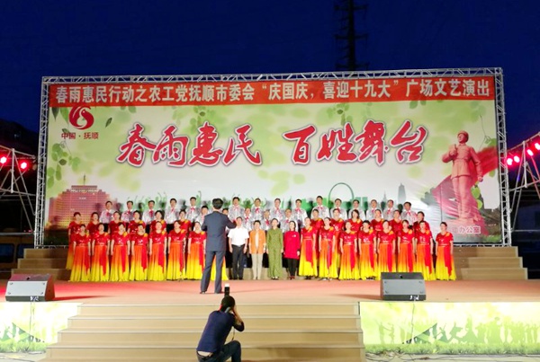 在中华人民共和国成立68周年、中国共产党第十九次代表大会即将召开之际,2017年9月17日,农工党抚顺市委会在大官屯火车站站前广场开展了“春雨惠民”行动——“庆国庆,喜迎十九大”广场文艺演出。抚顺市副市长、农工党抚顺市委会主委臧红,中共抚顺市委统战部常务副部长张玉伟,望花区副区长、农工党抚顺市委会副主委赵寰,新抚区副区长纪立冬等领导参加了演出。
