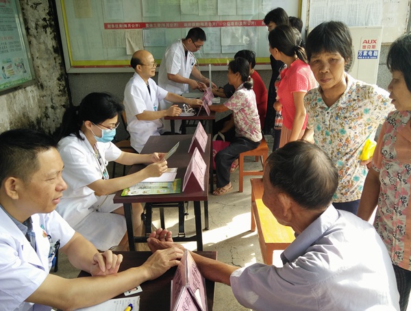 义诊现场,内科、儿科、妇产科、中医骨科、针灸理疗科等项目的农工党医疗专家,耐心地为当地群众诊病、理疗,就饮食、生活等各方面提出建议,并耐心给予指导用药。期间,提供量血压、测血糖等免费检查,为义诊群众送上常用药包。此外,向因暴雨导致洪涝灾害的村庄派发灾后防疫宣传资料和消毒药水,指导他们做好灾后防疫的相关工作。