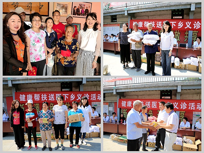 冯静、蒋文涵代表中华志愿者协会社区志愿者委员会向村民代表捐赠志愿者服装100套;李德龙、李鹏代表民革朝阳区委博爱志愿服务队向村民代表捐赠劳动、健康物资,工作服30套、通乳贴50盒、女士内衣30件;陆琳、丛莉代表本次送医下乡帮扶团队向村民代表捐赠医疗、健康物资,医疗洗手液50瓶,防四害药剂500盒。