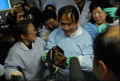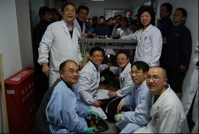 上午九时许,两位农工党员所在的全科医护人员开始进行手术模拟,经反复实验,于十点钟确定了手术方案,并在第一时间向医院院长鲁翔做了请示汇报。下午13点30分,手术正式开始。在吴萍护士长等人的协助配合下,范志宁主任采用导丝穿过球体牵拉出来的方法,于15点10分成功将排球成功牵引出体外,顺利完成手术。