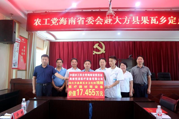 农工党海南省委会自帮扶与督查果瓦乡以来,坚决贯彻落实农工党中央号召,尽心尽力,尽职尽责,实施医疗扶贫和教育扶贫,累计向果瓦乡捐赠110余万元的医疗设备和教学设备等,为果瓦乡卫生院和果瓦中、小学补齐发展短板尽力而为,助力果瓦乡同全县一道实现脱贫摘帽。省委会在扶贫与督查过程中,还积极组织购买当地天麻、冬菘、猕猴桃等农特产品,消费扶贫24780余元。实打实的帮扶也得到了当地群众的一致肯定,果瓦乡卫生院代表全体干部职工和全乡村医现场赠送省委会一面“真心实意心关怀果瓦百姓 实实在在情系山乡医疗”的锦旗。