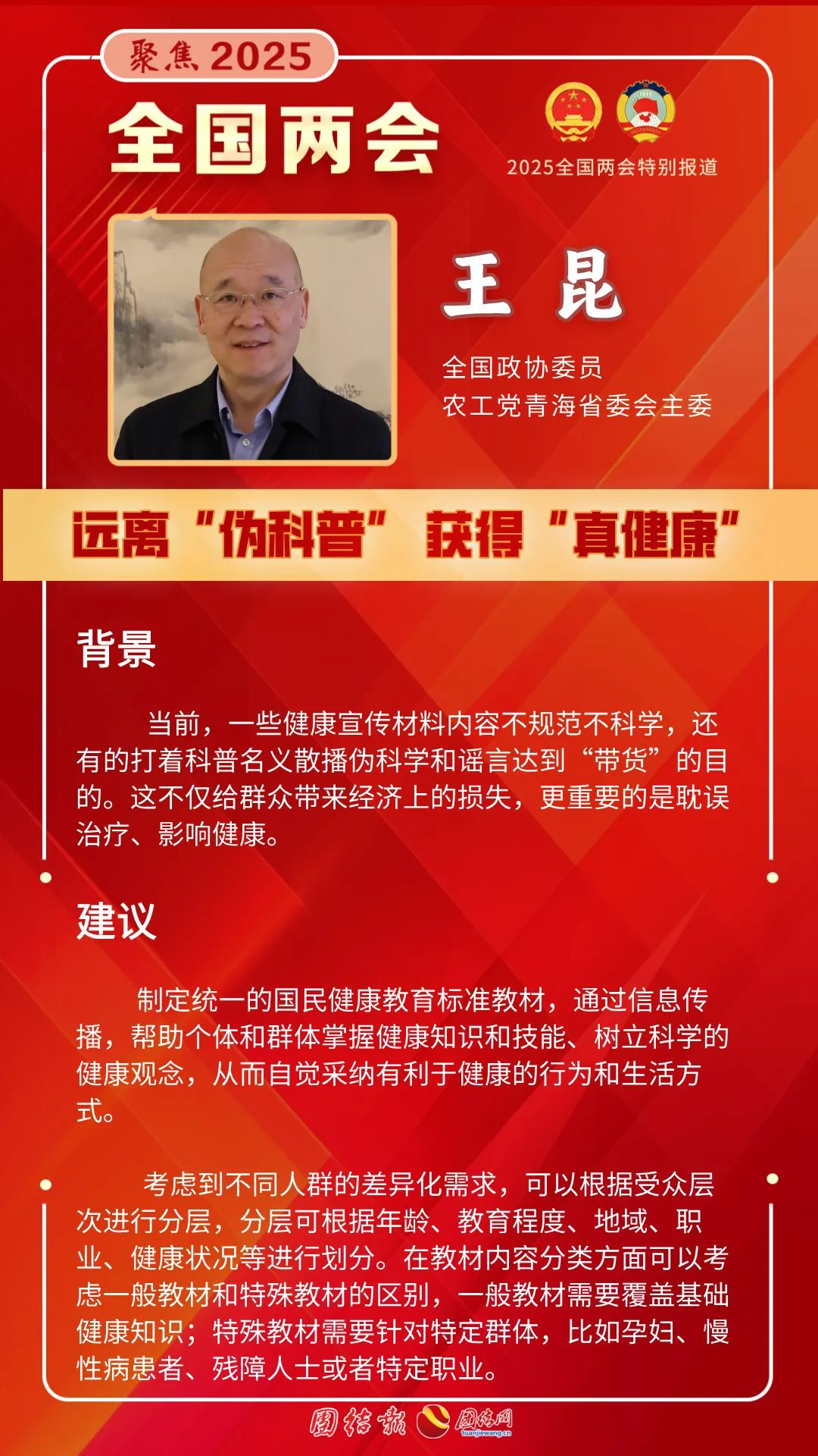“现在有一些健康宣传材料内容不规范不科学,还有的打着科普名义散播伪科学和谣言达到‘带货’的目的。这不仅给群众带来经济上的损失,更重要的是耽误治疗、影响健康。”长期围绕医疗卫生事业资政建言的全国政协委员、农工党青海省委会主委王昆关注到了这一问题。