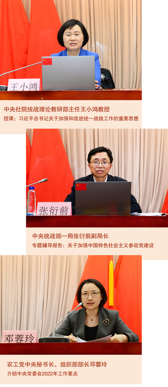 培训班邀请了中央社院统战理论教研部主任王小鸿教授,中央统战部一局张衍前副局长分别就习近平总书记关于加强和改进统一战线工作的重要思想、关于加强中国特色社会主义参政党建设进行授课和专题辅导报告。农工党中央秘书长、组织部部长邓蓉玲介绍中央常委会2022年工作要点。