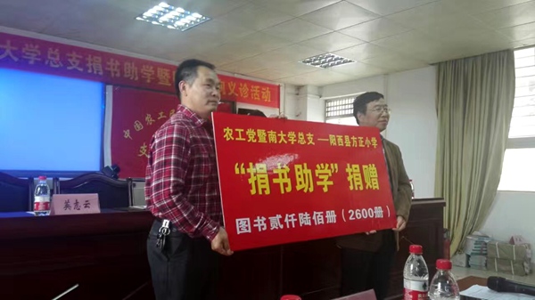 2016年11日11日上午,农工党暨南大学总支在主委赵仓焕博士带领下,赴阳西县开展捐书助学和医疗活动。阳西县县委对这次活动高度重视,中共阳西县委常委、统战部部长吴臻,副部长英志云到校迎接。