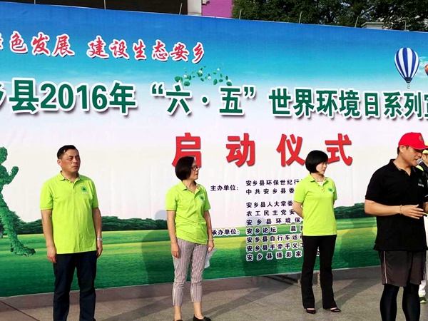 2016年6月5日上午,常德市安乡县环保世纪行组委会、中共安乡县委宣传部、县人大办、农工党常德市安乡支部、县环保局主办了主题为“推进绿色发展,建设生态安乡”的2016年世界环境日系列宣传活动,百余名志愿者参与活动并以实际行动宣传环境保护理念、支持生态文明建设。