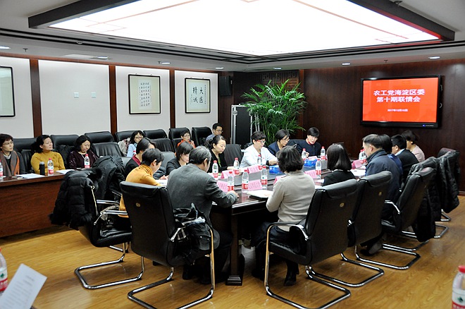 2017年12月15日,农工党海淀区委会在中国中医科学院西苑医院杏苑楼召开第十期联情会。中共海淀区委常委、组织部部长、统战部部长周志军、中共海淀区委统战部常务副部长刘珍和西苑医院、清华大学等15家单位的中共党委领导应邀出席。农工党海淀区委会主委徐凤芹、副主委段新芳、吴敏华、胡敏健、张盼月、于逢春和区委各基层组织负责人参会。会议由胡敏健主持。