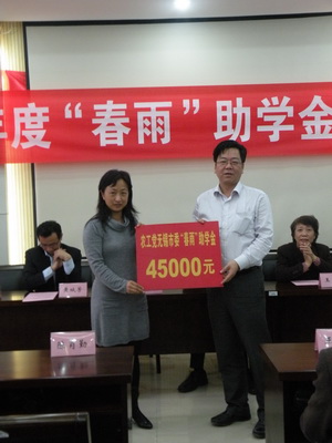 11月18日下午,农工党无锡市委“春雨助学金”2011年度颁发仪式在江南大学医药学院举行。无锡市人大常委会副主任、农工党无锡市委主委曹锡荣到会并讲话,副主委兼秘书长汤忠元向江南大学代表授予了助学金。出资的三位非公经济界农工党员代表也出席了颁发仪式。