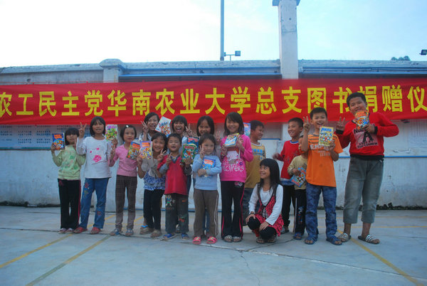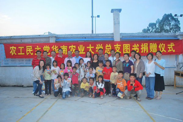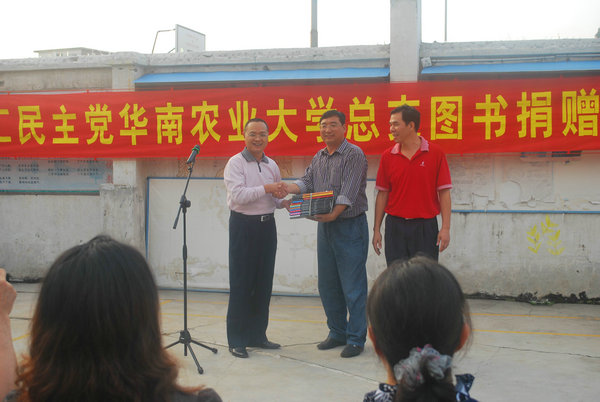 为落实中共十七届五中全会推动文化事业建设精神和响应中共广东省委建设幸福广东号召,11月18日,农工党华南农业大学总支一行16人在学校党委统战部大力支持下,驱车200公里来到肇庆市德庆县九市镇甘力村,向德庆农家书屋赠送7400多册期刊图书。中共德庆宣传部崔杰汉副部长、德庆县文广电新局冯瑞文副局长出席了捐赠仪式。在捐赠仪式上,主委倪根金教授代表总支简述总支捐书经过,希望这批以百科知识为主的图书能为德庆新农村建设,特别是乡村的文化建设、丰富村民文化生活尽绵薄之力。崔副部长代表德庆政府和当地群众感谢农工党华农大总支捐书义举,并表示将最大限度发挥这些图书的作用。捐赠仪式结束后,农工党员在甘力村农家书屋主人李志强先生引导参观了这间被评为“广东省优秀农家书屋”的各类活动场所,对书屋齐全的措施感到惊讶,对书屋主人无私贡献深表敬佩。