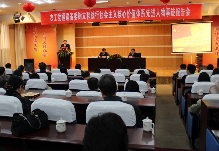 12月3日,农工党福建省委在福州举办“学习中共十七届六中全全精神暨树立和践行社会主义核价值体系先进人物事迹报告会”。全国政协常委、农工党福建省委主委陈绍军出席并讲话。他充分肯定了近两年来,农工党福建省委在农工党中央的领导下,按照《农工党中央树立和践行社会主义核心价值体系三年工作规划》和中共福建省委统战部的要求,发动我省农工党各级组织深入开展社会主义核心价值体系学习教育活动,基层组织自身建设水平得到提升,党员的思想政治素质得到提高,为我省农工党切实履行参政党职能奠定了坚实基础。