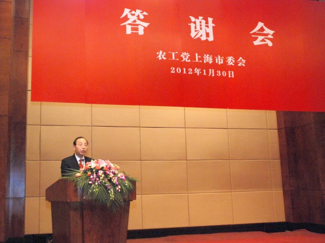 1月30日下午,农工党上海市委假座锦江饭店小礼堂举行2012年新春答谢会。市政协副主席、农工党市委主委蔡威,副主委姚俭建、刘仲苓、黄峰 平、金如颖等农工党市委领导同中共各级党委、党委统战部和农工党各级组织负责人欢聚一堂,共话发展、畅叙友情。中共上海市委统战部副部长吴捷出席会议并讲 话。