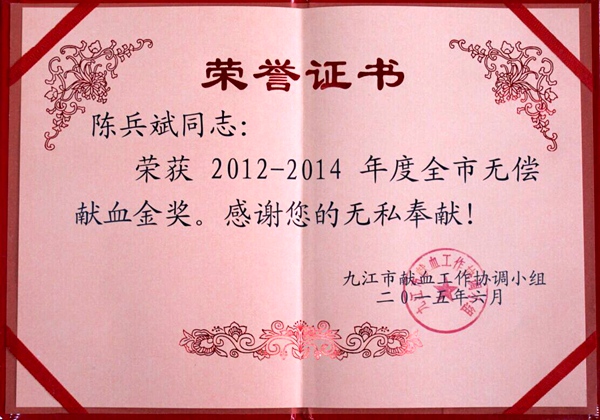2015917日,九江市献血工作协调小组根据《九江市无偿献血表彰奖励办法》发布光荣榜,对在2012年——2014年度无偿献血工作中做出突出贡献、获得奖励的人员通报表彰,农工党九江市机关支部党员陈兵斌获全市无偿献血奉献奖金奖。