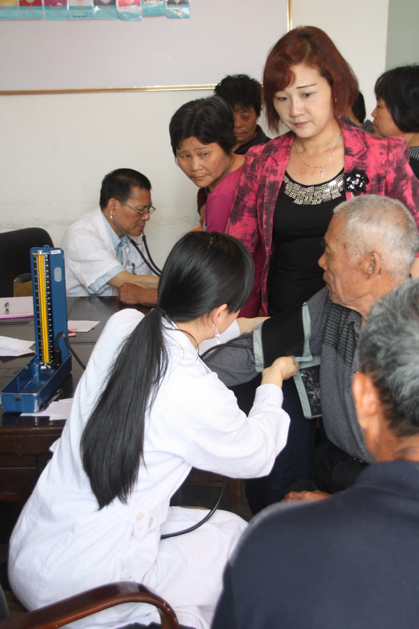 “阿婆,你心脏还好兮,血压有点高,我给你开点药。”心脏中心施陈刚教授给老人们检查心脏,一旁的烧伤科护师毛红英、王天心、王理聪以及手术室护士潘海飞则忙着给中、老年人量血压。