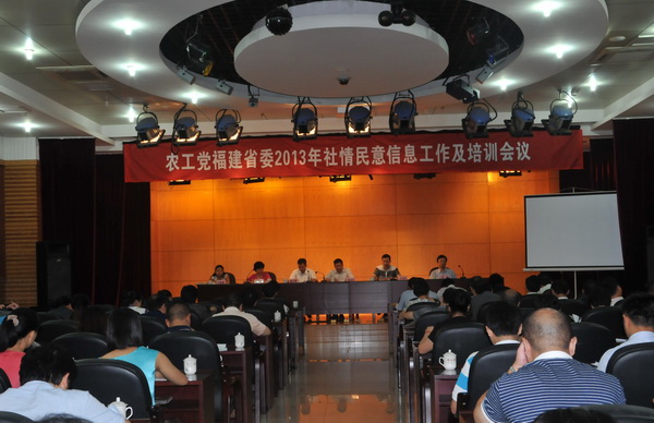 2013年8月30日至9月1日,农工党福建省委2013年社情民意信息工作及培训会议在福州召开。会议由省委会秘书长陈巧主持。福建省政协副主席、农工党福建省委主委陈绍军出席会议并讲话,农工党福建省委副主委赖应辉全程参加了会议。来自省委会专委会负责人、九个设区市的专职副主委、信息联络员、县级市委会的专职干部、省委会特约信息员及省委会机关干部共70余人参会。