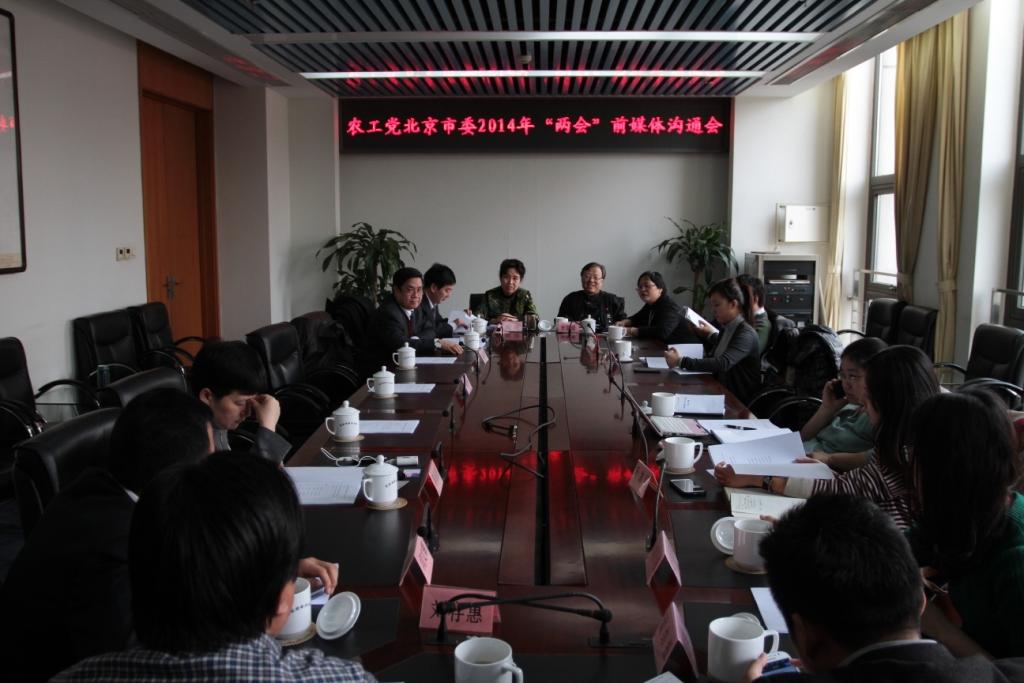 为做好“两会”前媒体沟通工作,通过媒体让社会更多的了解农工党北京市委“两会”履职情况,2014年1月7日下午,农工党北京市委召开“两会”前媒体沟通会。市委邀请了北京日报、光明日报、人民政协报、团结报、北京晚报、北京晨报、千龙网等新闻媒体同部分农工党北京市政协委员、人大代表齐聚一堂,相互交流。市委专职副主委张新建,市委专职副主委兼秘书长刘迎,市委副主委邢念增出席会议。会议由市委宣传处处长张亚娟主持。