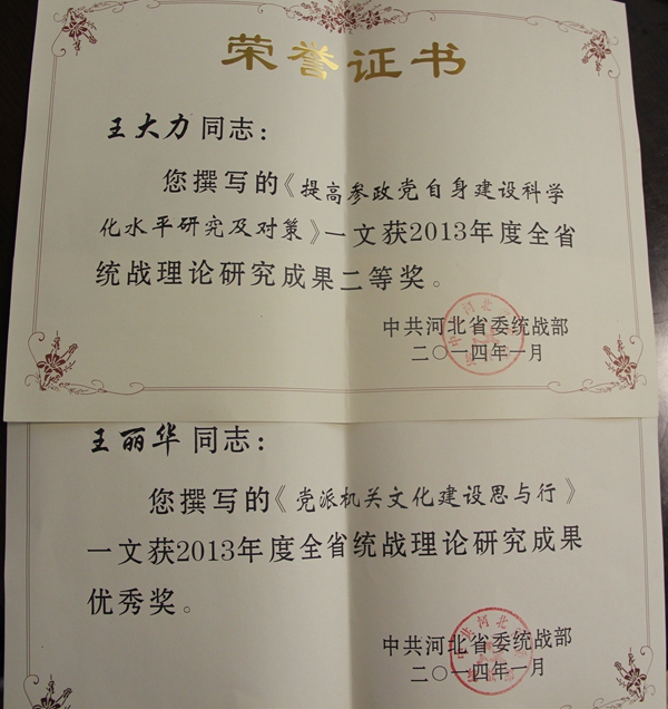 2013年,农工党河北省委会高度重视理论研究工作,向全省各级组织下发《理论研究重点课题》和《加强作风建设理论研究课题》,组织全省各级组织开展理论研究工作,向中共河北省委统战部和农工党中央报送唐山、秦皇岛等市撰写的理论文章9篇。其中,农工党唐山市委会王大力撰写的《提高参政党自身建设科学化水平研究及对策》获全省统战理论研究成果二等奖,王丽华撰写的《党派机关文化建设思与行》获全省统战理论研究成果优秀奖。(李晓辉)