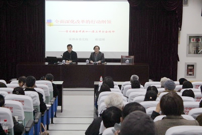 报告会邀请了中共常熟市委党校高级讲师谢建刚前来为党员进行讲座。他结合该市经济社会发展实际情况,从增强全面深化改革和激发深化改革的动力机制等方面作了学习贯彻中共十八届三中全会精神的主题报告。报告内容丰富,不仅有独特的理论见解,而且有丰富生动的案例,对民主党派成员学习中共十八届三中全会精神有很强的指导性。