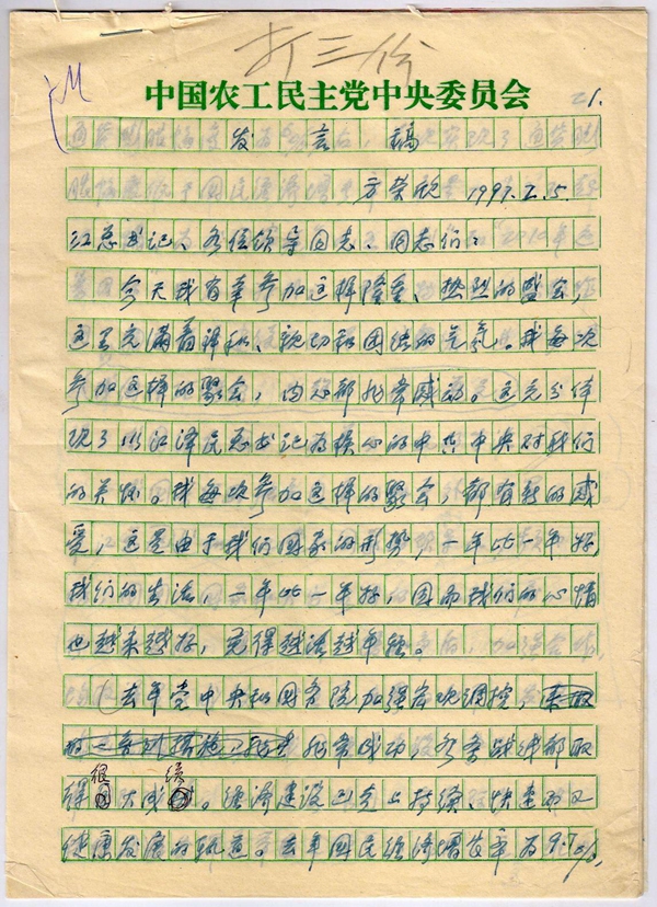1997年上半年,《健康报》记者王雪飞采访时任中科院院士、上海血液学研究所所长陈竺的手稿《赤子情怀——记中科院院士陈竺》。亦由农工党东海支委购藏。主要包括1997年6月5日《健康报》第一版《发稿签》和全文手稿等20页。