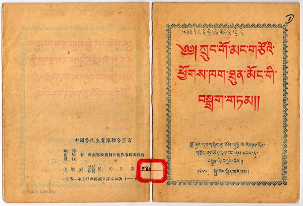 另一件珍贵文献是广西某私人所售《中国各民主党派联合宣言》。该宣言由西南军政委员会民族事务委员会1951年5月翻译、出版、发行。前部分为藏文,后部分为汉字。宣言说:“中国各民主党派誓以全力拥护全国人民的正义要求,拥护全国人民在志愿基础上为着抗美援朝保家卫国的神圣任务而奋斗。”宣言署名为:“中国共产党、中国国民党革命委员会、中国民主同盟、民主建国会、中国人民政协无党派民主人士、中国民主促进会、中国农工民主党、中国致公党、九三学社、台湾民主自治同盟、中国新民主主义青年团。1950年11月4日。”
